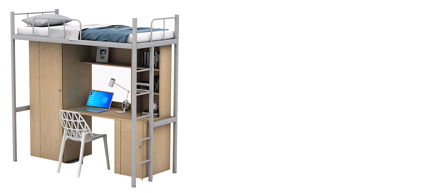Its elevated metal structure creates a full study zone underneath, allowing students or boarders to sleep, store, and work—all in one compact footprint.