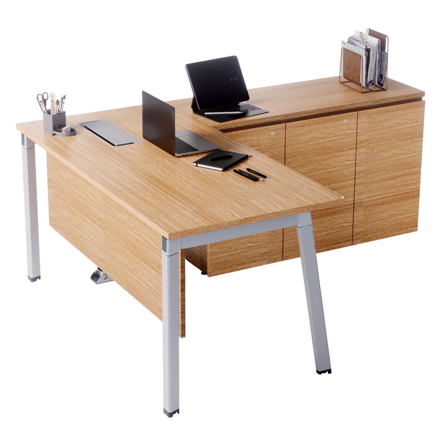 The workstation includes sleek modesty panels that add both structure and visual refinement. Available in metal or prelam board, they provide a clean, professional finish while enhancing privacy.